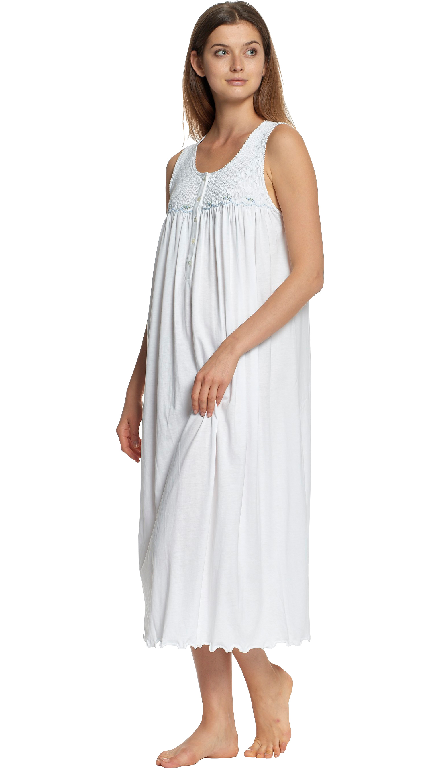Hand smocked white fine jersey long gown, hand embroidered with blue flowers.