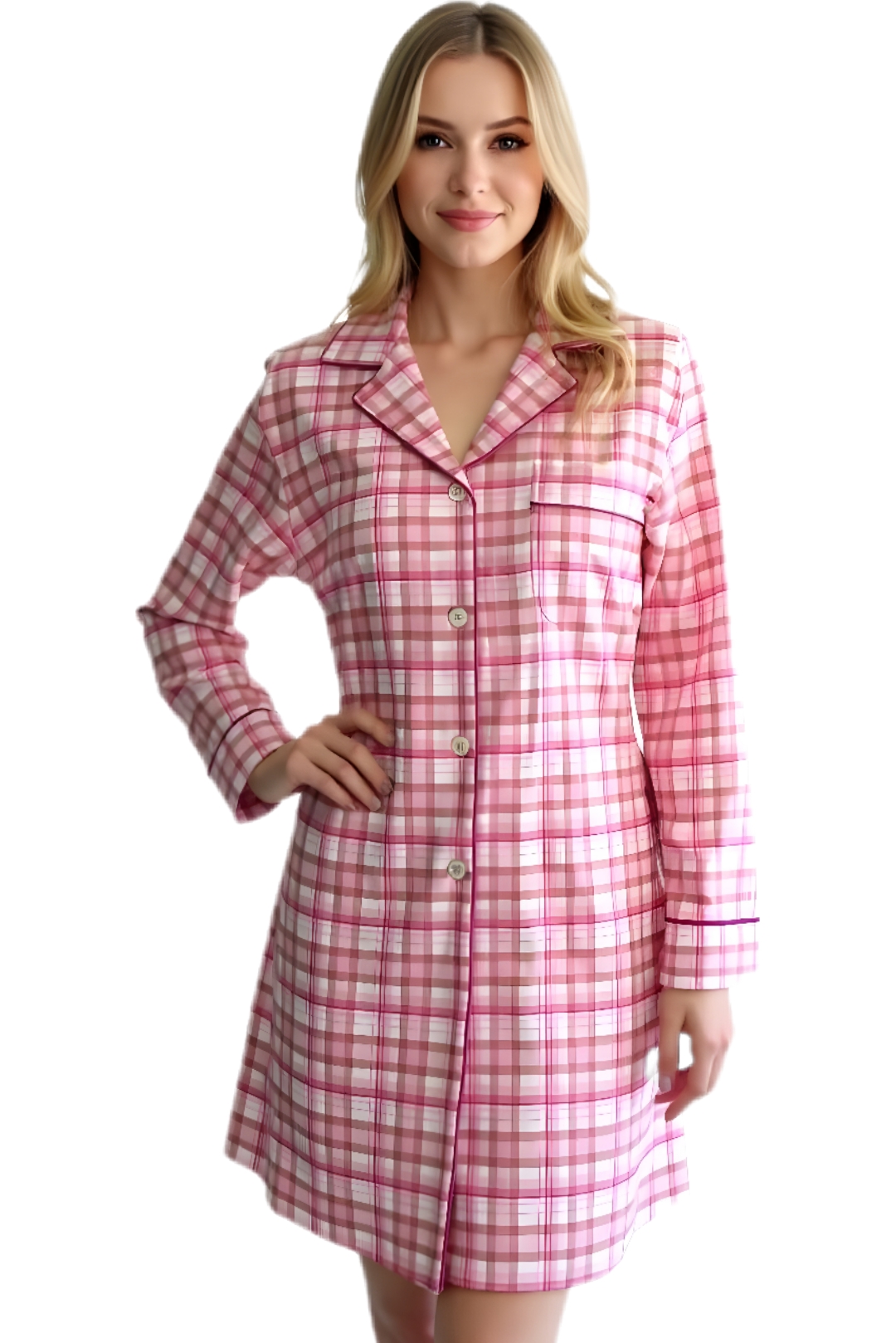 Quality:100% pima flannel, brushed on both sides, yarn-dyed for better color retention. Silky cordedge. Real mother of pearl buttons. French seams. 38" long length.