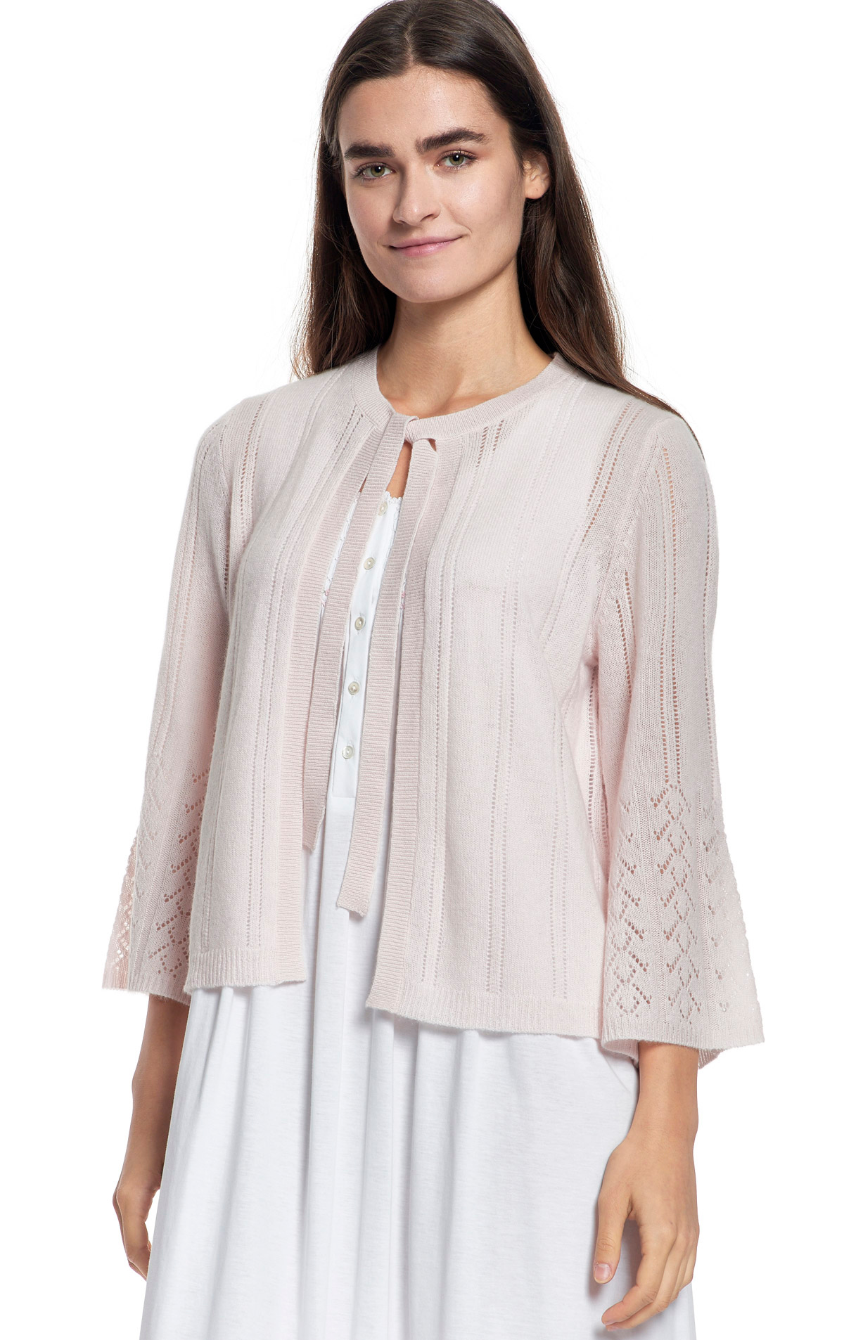 We used the finest cashmere to make this light weight but warm bed jacket that feels like heaven. The colors are delectable and the combination of different stitches makes it perfect.